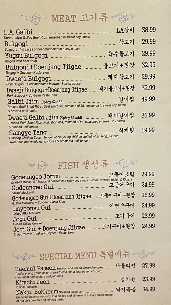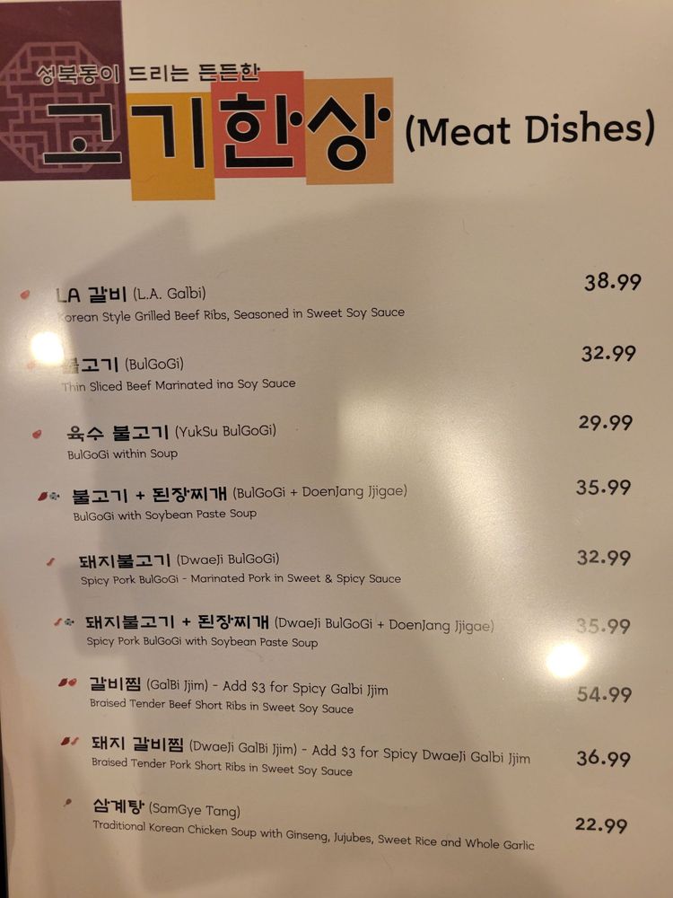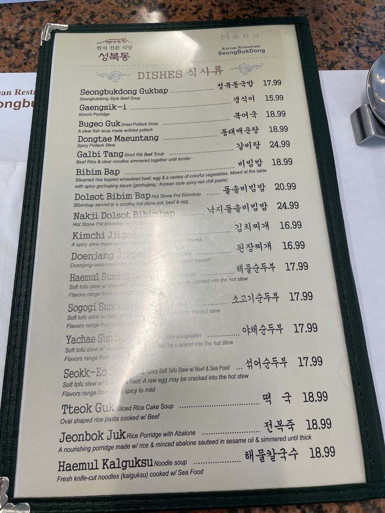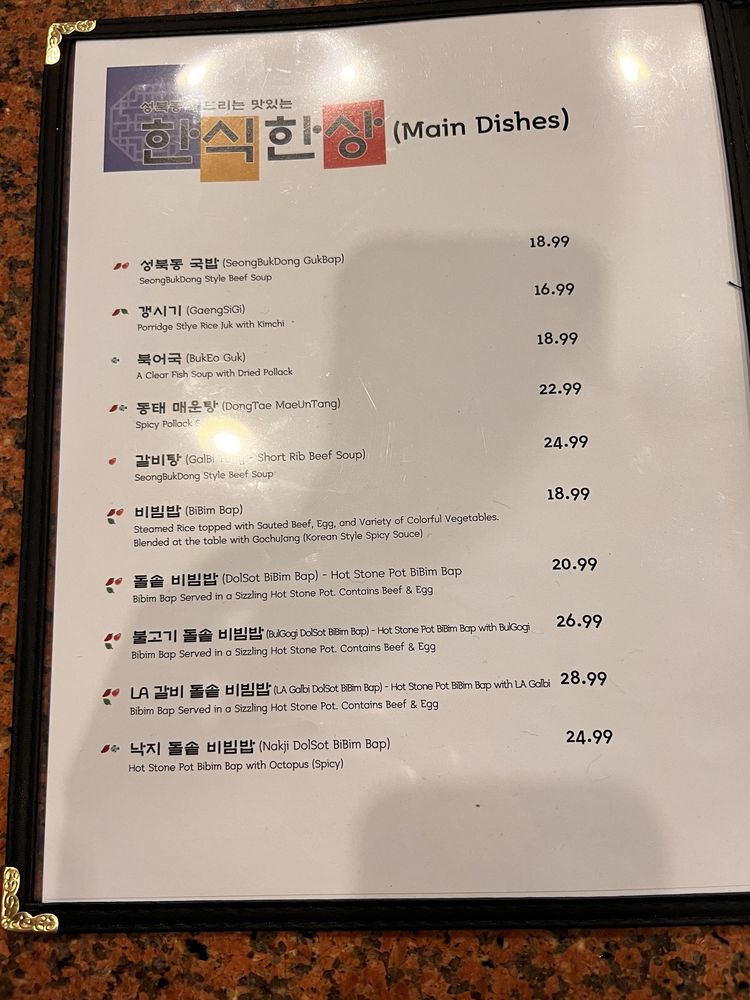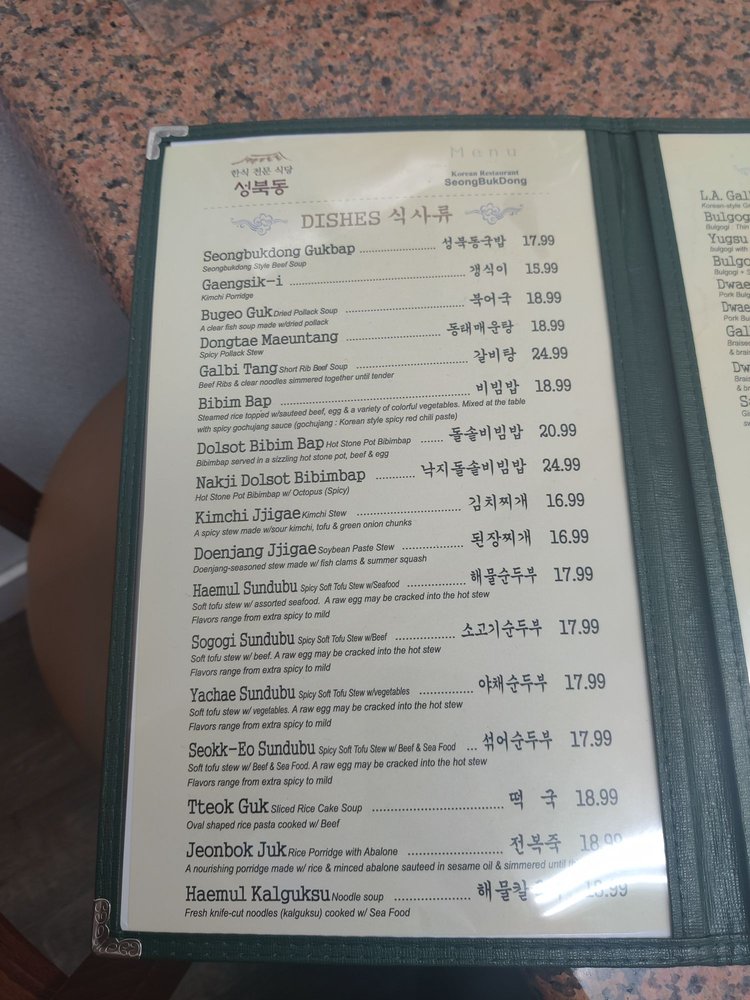 Seong Buk Dong, a Korean restaurant in Los Angeles, offers a variety of authentic dishes that are sure to delight your taste buds. From the flavorful Seongbukdong Gukbap to the spicy Nakji Dolsot Bibimbap, there's something for everyone to enjoy. The restaurant is known for its exquisite Galbi Tang and delicious Godeungeo Jorim. Customers rave about the exceptional service and welcoming atmosphere, making it a must-visit spot for any Korean cuisine enthusiast. With a diverse menu that includes vegan options and traditional favorites like Kimchi Jjigae and Haemul Kalguksu, Seong Buk Dong truly stands out as a gem in LA's dining scene. Whether you're looking for a cozy meal or a memorable dining experience, this restaurant is sure to exceed your expectations.